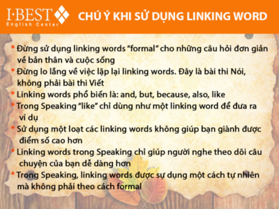 Hai phần trước, chúng ta đã tìm hiểu về hệ thống linking words và cách sử dụng chúng. Nếu bạn nào chưa xem, có thể xem thêm PHẦN 1 & … More Các linking words trong IELTS Speaking (phần 3) »